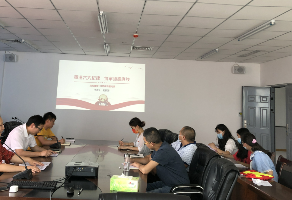 为加强党员教育的针对性,增强全体教师廉洁自律意识和拒腐防变能力,6月16日,太阳成集团tyc122cc党总支纪检委员孔新海同志在公司会议室以《重温六大纪律,筑牢师德底线》为题,开展党课教育。