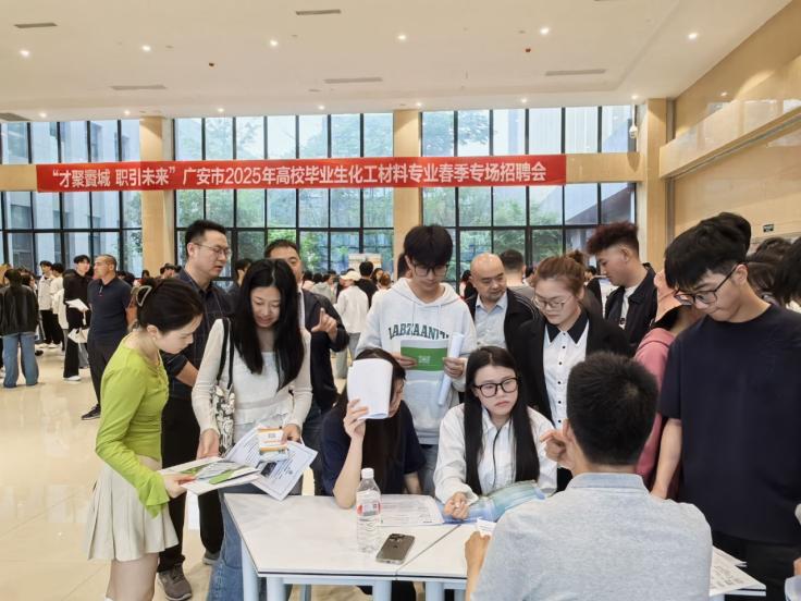 为深入贯彻党的二十大精神,切实做好公司2025届未就业、2026届毕业生就业工作,促进毕业生高质量就业,4月29日,由广安市人力资源与社会保障局、太阳成集团tyc122cc、广安经开区市域产教联合体共同主办的“才聚賨城 职引未来”广安市2025年高校毕业生化工材料专业春季专场招聘会在格致楼一楼举行。招聘会由太阳成集团tyc122cc、人才招聘处共同承办,共邀请了省内外19家规上企业参加,提供化工材料领域就业岗位420个。公司部分2025届未就业员工、2026届全体毕业生参加,现场气氛热烈。